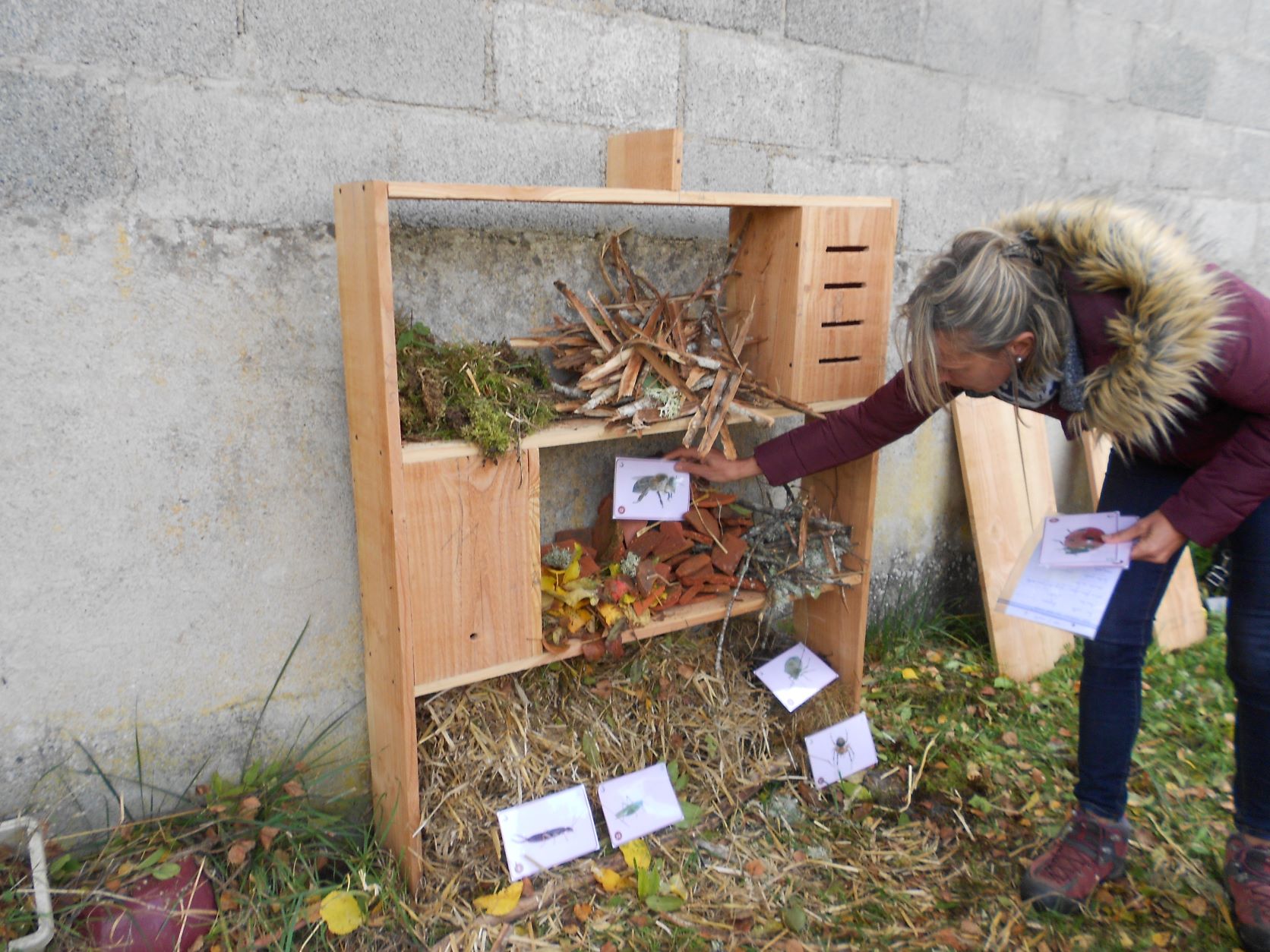 - Collecte et répartition des différents matériaux dans l'hôtel à insectes pour accueillir les petites bêtes qui vont s'y installer.( paille, tuiles, écorces de bois...) Les insectes pondent leurs œufs dans les compartiments où les larves passent l'hiver au chaud.