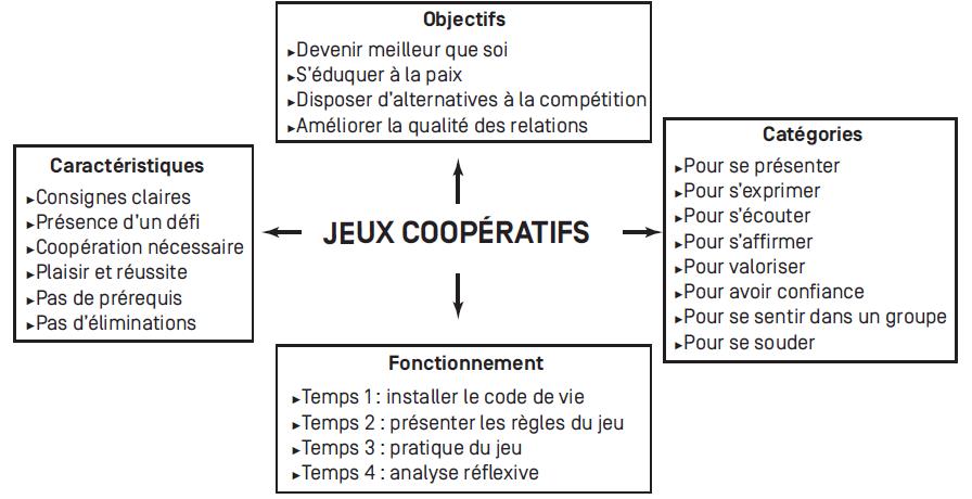 Les jeux coopératifs reposent sur la poursuite d'un objectif commun pour tous les joueurs. Cet objectif ne pourra être réalisé que par l'entraide et la solidarité entre eux.