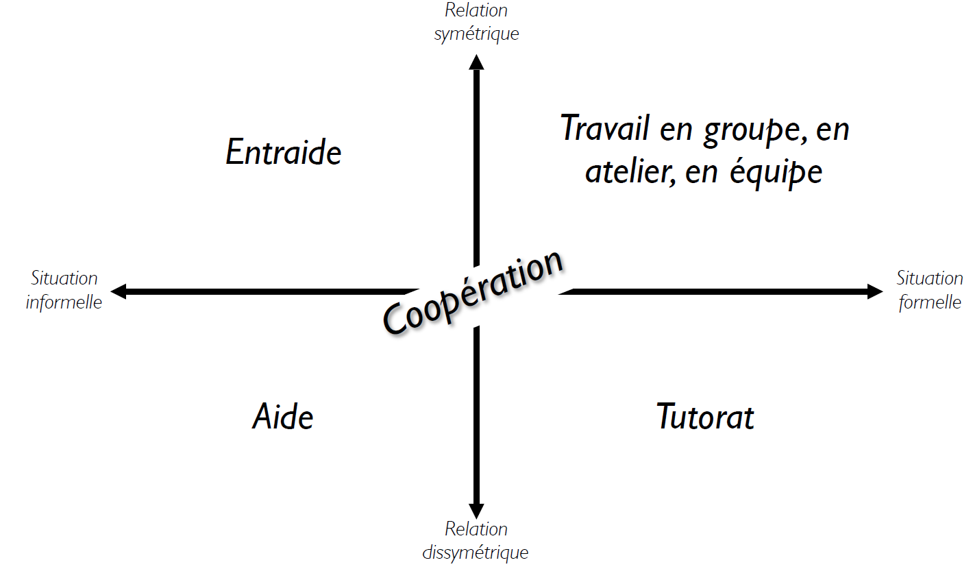 Ainsi le tutorat ne doit pas être vu comme une fin en soi mais comme un élément qui s’inscrit dans un fonctionnement global de classe. C’est une ressource parmi d’autres dans la construction de la pratique coopérative.
